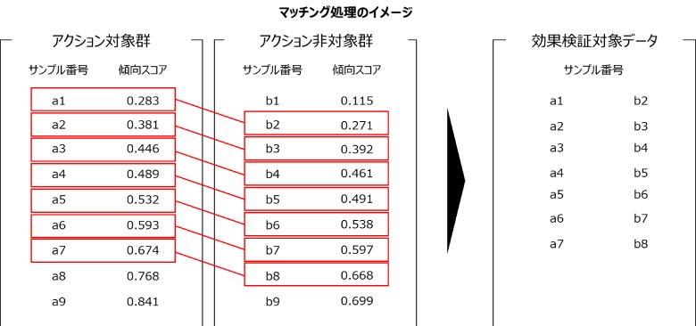 理論的に、傾向スコアが同じサンプル同士は交絡因子も均質になっていると見做して良いという性質があるため、このような手順を取ることで効果検証が可能となる