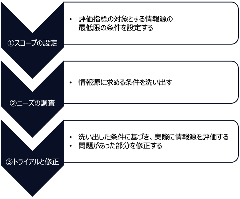 評価指標の仮設定と測定可否の検証を終え、すべての評価指標を測定可能であると確認した後は、各評価指標において情報源の「採用/不採用」を判断する合格ラインを設定すれば評価指標は完成となります。次章で実際に完成させた評価指標を紹介します。