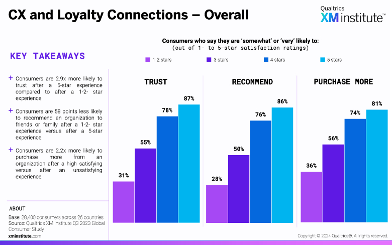 前述の通りCXマネジメント活動を通して事業成長への貢献が期待できますが、その有用性を示す例として、Qualtrics社の実施した消費者調査をもとに2点ご紹介します。