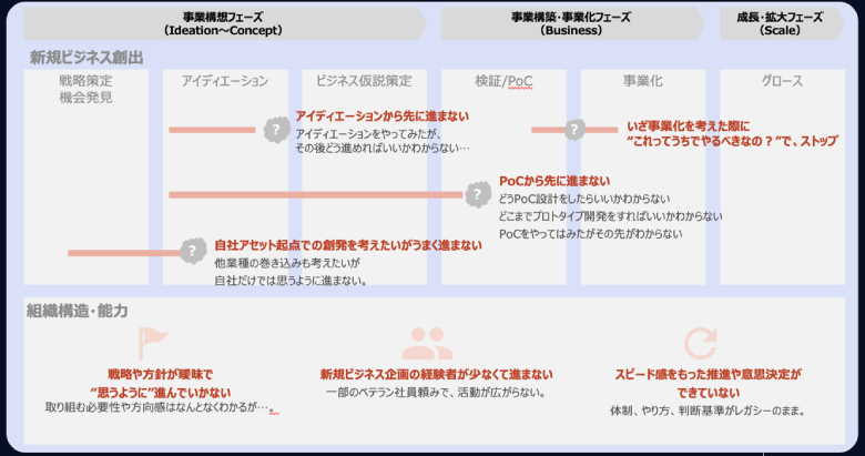 新規事業開発のメカニズムの理解が不十分なために、新規事業開発に既存事業のロジックをそのまま適用する傾向や、新規事業開発のメカニズムの不十分な理解に起因する、既存事業や定常業務における優れたリーダーの新規事業開発への割り当てなども起こりがちです。結果、「革新的アイデアを生み出せない」「新しいコンセプトを作成できても検証に苦労する」「新規事業として上市に到達できない」などの問題が発生します。
