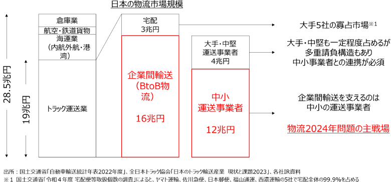 現在、日本の物流市場規模は全体で約28.5兆円にのぼり、そのうち約19兆円をトラック運送業が占めている。トラック運送というと、多くの人にとって身近なBtoC(宅配)のイメージが強いが、実はBtoC(宅配)の市場規模は約3兆円にとどまり、残りの約16兆円はBtoB(企業間輸送)が占める。さらに、このBtoB(企業間輸送)物流の内訳を見ると、大部分の約12兆円を中小の運送事業者が支えている。物流2024年問題の主戦場は、中小の運送事業者による企業間輸送なのだ。