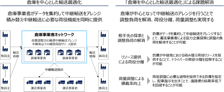 「私たちが考える複数拠点間の中継輸送モデルにおいて中心となるのは、中継地である倉庫です。複数の倉庫事業者のネットワークを構築したうえで、荷主と荷物と運送事業者のデータを集約し、最適な中継輸送をアレンジし、輸送指示を出せるようにします。さらに、運送事業者ではなく倉庫事業者が積み替えに欠かせない荷役の機能をも提供します。これにより、中小の運送事業者は積み替えの協力事業者を探す必要がなくなり、荷役など運転以外の業務の負担も削減できます。最大のメリットは、荷量調整によって、復路便の積載率を向上させられることです。このプラットフォームによってすべての運送事業者が元請けとなることができれば、2024年問題の根本にある多重元請け構造の解消にもつながり、大きな意義があると考えています」(南田)