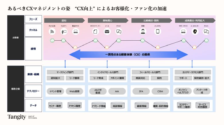 では、CXをマネジメントするとは、どういうことなのでしょうか。それは、社内の組織や業務の壁を越えて、「一貫性のある体験を提供し、お客さま化・ファン化を加速させていくこと」であると考えています。
