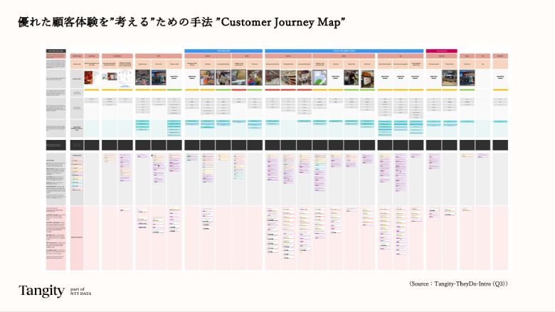 NTTデータは、企業のCX向上支援を強化するため、2024年7月に“TheyDo”を提供するオランダ・アムステルダム発のスタートアップ企業TheyDo社とパートナーシップ契約を締結しました。NTTデータではデザイナー集団「Tangity」を中心に、CX戦略の立案から実行までの業務に“TheyDo”を取り入れています。具体的には、お客さま企業とともに、部門ごとに個別に管理されているカスタマージャーニーマップを部門横断的に一元化し、高品質なCXの設計と迅速な実行を進めています。