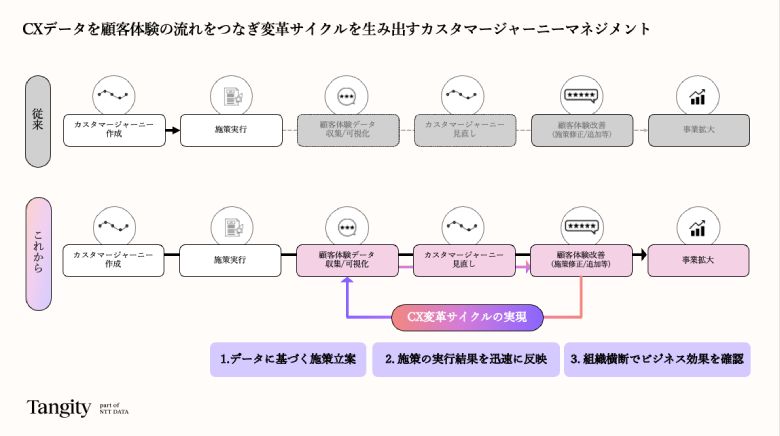 顧客接点が多様化する中、カスタマージャーニーマップを作成し、施策を検討・実施するだけでは、一貫したCXを提供していくことはできません。多様な顧客接点から得ることのできるデータを活用して、施策の効果検証を行い、それに基づきカスタマージャーニーマップを見直していく。こうした継続的なCX変革サイクルを構築することが大切です。それこそが「カスタマージャーニーマネジメント」であり、市場の変化スピードが速くなっているこの時代に重要となる考え方なのです。