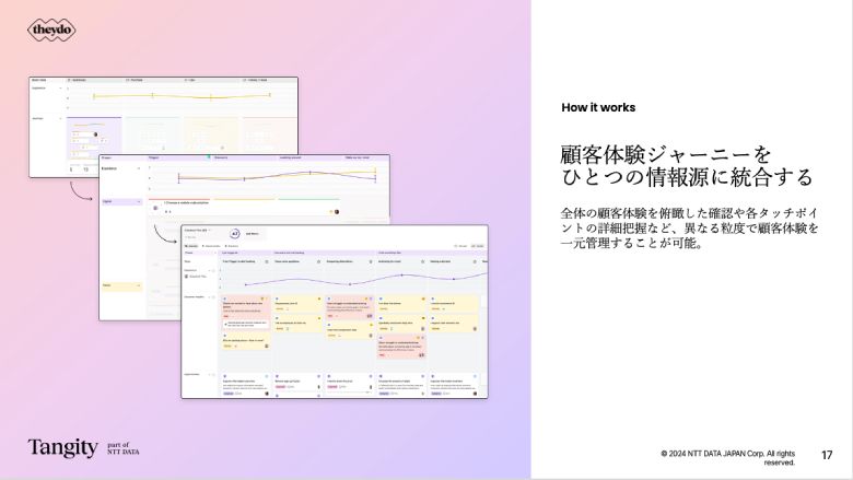 NTTデータはTheyDo社との協力をさらに深め、「Tangity」を中心に“TheyDo”の習熟者育成に取り組んでいきます。また、両社の専門知識と技術力を結集し、お客さま企業に対してCXの課題を解決するための包括的なサポートも展開していきます。