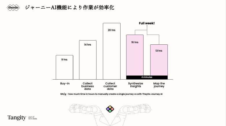 もう1つ、“TheyDo”の特徴としてあげられるのが、「Journey AI」というカスタマージャーニーマップの型を作ってくれる機能です。Miroや、Word、Excelなどで作成したインタビューデータやリサーチデータなどを“TheyDo”上のAIに読み込ませると、効率的にカスタマージャーニーマップを作成します。TheyDo社が提供している情報では、カスタマージャーニーマップの作成にかかる時間が39時間(1週間程度の稼働)から4分に短縮された例もあります。