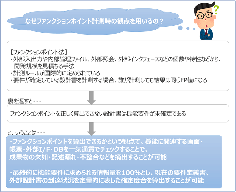 特に(6)で記載している「ファンクションポイントを算出できる記述になっているか」については、機能要件の確定度合いを評価するための重要な観点になります。