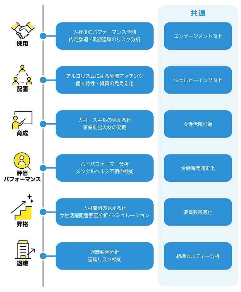 企業の人事部門は、「採用」「配置」「育成」「評価・昇格」「退職」というエンプロイージャーニーの各フェーズでさまざまな課題と悩みを抱えています。入社後のパフォーマンス予測、アルゴリズム活用による配置マッチングの納得度向上、退職の要因分析や予兆検知など、それぞれのフェーズでピープルアナリティクスを実践できる可能性があるのです。