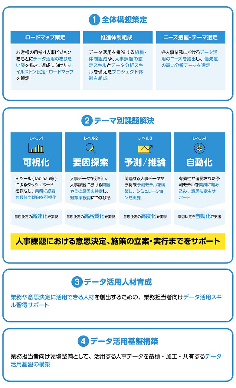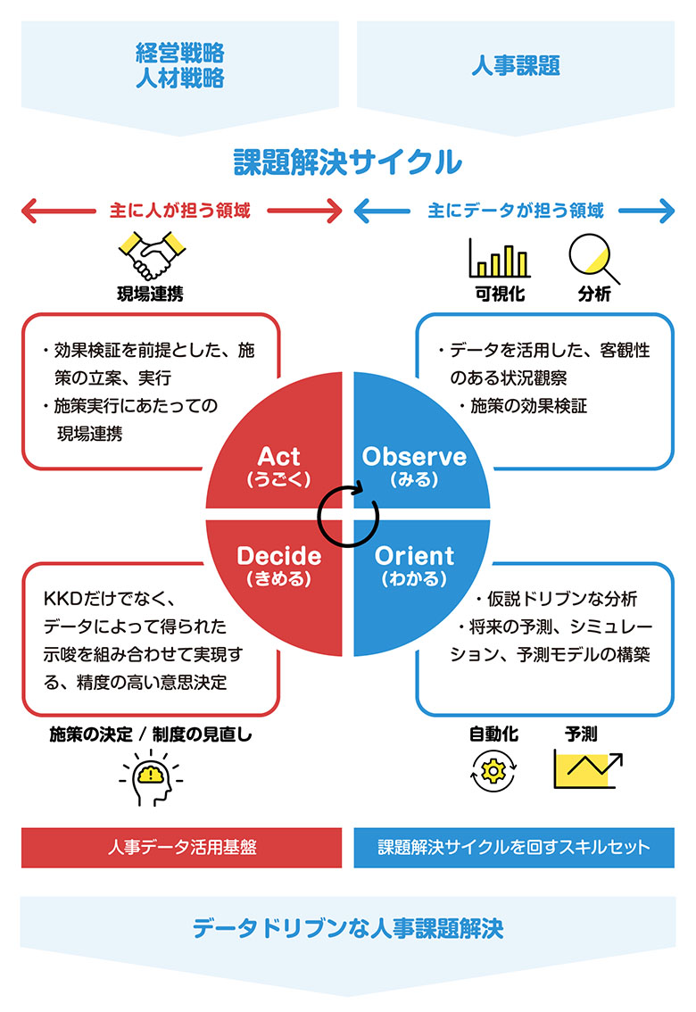 また、これらの分析結果をもとに施策の立案・実行を行うと共に、データ活用人材の育成やデータ活用基盤の構築を行い、継続的にデータドリブンな人事課題解決を実践するための土台作りも忘れてはいけません。