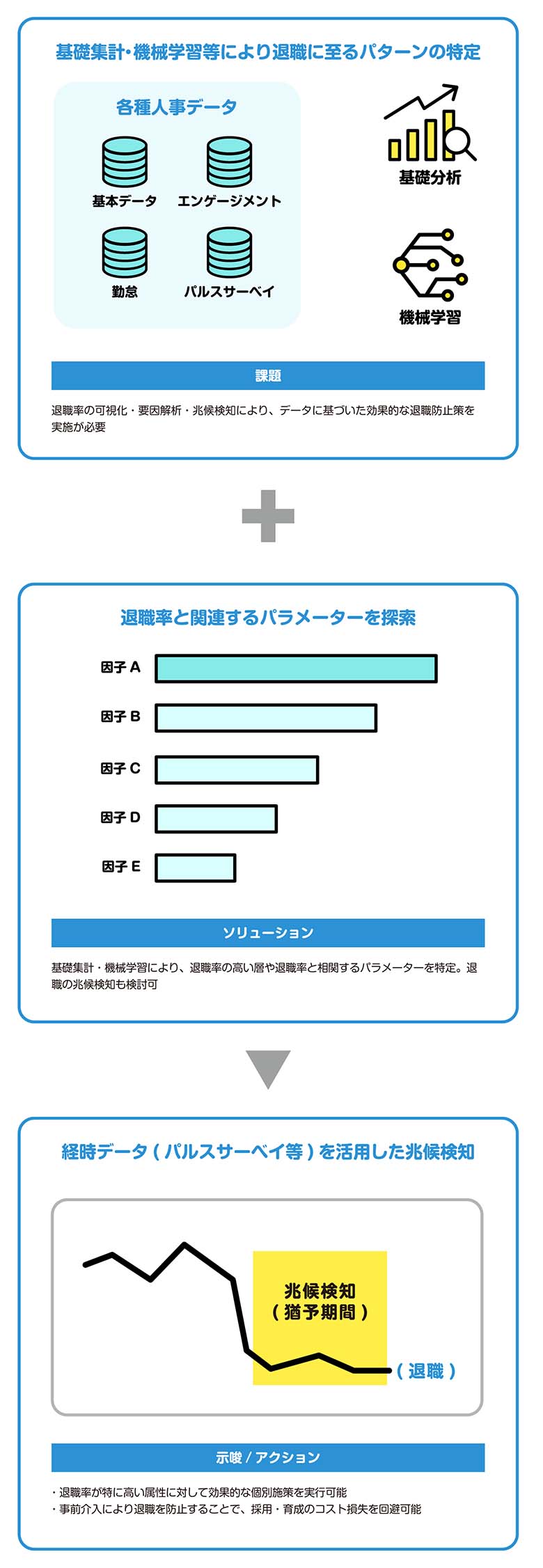 年齢・所属・職種などの属性、エンゲージメント、労働時間、経験業務、キャリアの意向などさまざまなデータを集計し、さらにAI・機械学習を活用することで、退職率の高いセグメントを特定するとともに退職に影響するパラメーターを探索しました。
