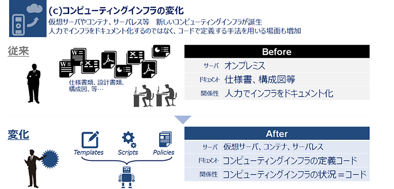 新しいコンピューティングインフラが誕生する以前に物理サーバを用いていた時代には、人力でコンピューティングインフラの状態をドキュメント化していましたが、新しいコンピューティングインフラではインフラの状態をコードとして管理するIaC(Infrastructure as Code)という手法を用いることが増えました。