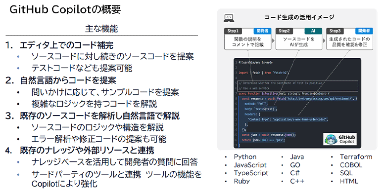 GitHub Copilotは、膨大なコードデータセットやドキュメントを学習しているため、PythonやJavaScriptのような広く利用されているプログラミング言語から、COBOLのような特定用途の言語、Ansibleによる構成管理、Markdownを用いたドキュメント作成などにも対応しています。