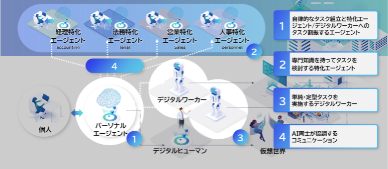 例えば、法人営業における活用イメージはこうだ。営業担当者は、アプリケーション上のチャットでパーソナルエージェントに初期訪問、提案、契約締結などの業務を依頼する。すると、パーソナルエージェントがプロジェクトリーダーとして動き出し、営業、提案書作成、稟議(りんぎ)書作成、法務など、さまざまな専門性を持った複数のAIエージェントを自律的に選定し、連携する。これを受けてAIエージェント同士が協調し、自らタスクを細分化してひとつひとつのタスクを自律的に実行してくれる。