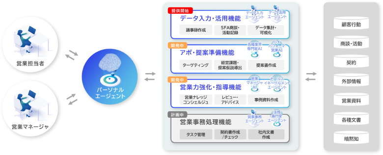 同サービスは段階的な機能提供を予定しており、第1弾として、データ入力・活用機能の提供を、2025年3月の第2弾では顧客経営課題分析から提案書作成までを実行するアポ・提案準備機能を提供する予定だ。