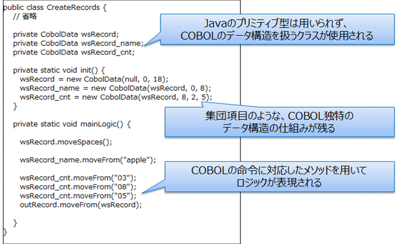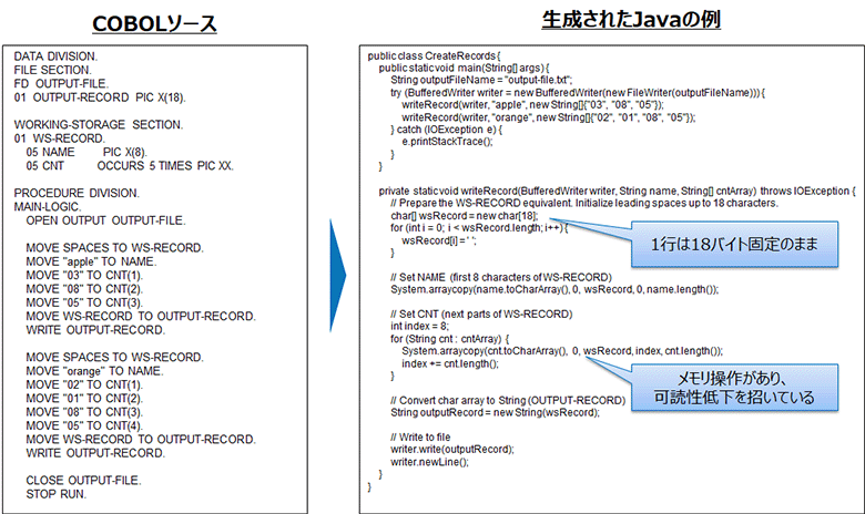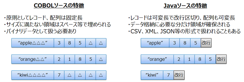 COBOLソースとJavaソースでは、オブジェクト指向の有無によるプログラム構造の違い、扱える型の違い、エラーハンドリングの違いなどいくつかの相違点がありますが、代表的なものとしてメモリ領域、ファイルのレコードの固定長/可変長の違いがあります。