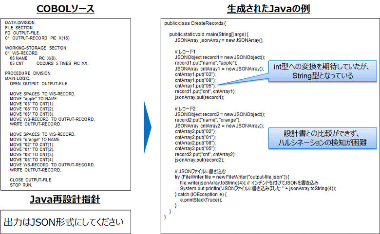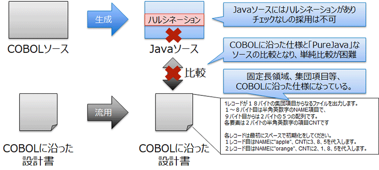 近年、生成AIの精度向上によりCOBOLの知識を必要としない「PureJava」なソースの生成ができるようになりつつあります(※)。しかしその一方で生成AIを用いたJavaソース生成には不正確な結果が含まれるハルシネーションの問題があります。ハルシネーションの有無を確認するためには、人間が内容をチェックする必要がありますが、現行の設計書を修正せずそのまま流用した場合、設計書にはCOBOLに沿った仕様が記述されているため、設計書とソースの比較が困難になるという問題があります。