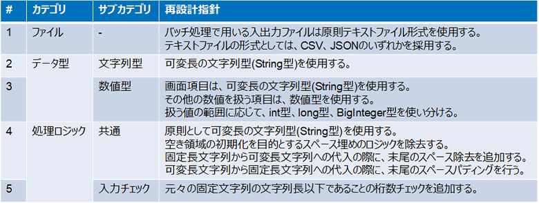 再設計指針の具体例として、「画面項目は、可変長の文字列型(String型)を使用する。その他の数値を扱う項目は数値型を使用する。扱う値の範囲に応じて、int型、long型、BigInteger型を使い分ける」があります。COBOL仕様を確認し画面項目かどうかを確認することにより、正しいJava仕様を作成することができます。