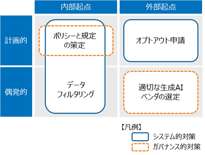ここでは【1.生成AI利用に潜むリスクとは】で述べた2つのセキュリティリスクを題材に、どのような対策があるかを、ガバナンス・システム両観点から検討します。