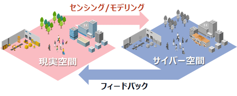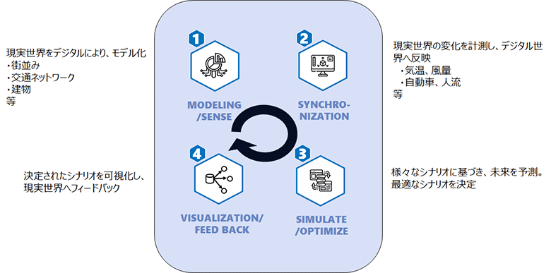 デジタルツインとは現実世界をデジタル化し、様々なシナリオに基づくシミュレーションを行い、最適な方法を発見し、現実世界へフィードバックすることで社会、企業および個人の利益を最大化するものです。(図1)