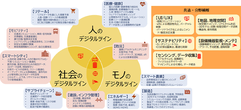 デジタルツインは製造業を中心に技術適用が始まり、IoT機器の発展による取得可能なデータの増加、現実世界の再現精度(モデリング)の向上、大規模シミュレーションや高精度な可視化が可能となったことで、都市計画、建設業、農業、医療など様々な業界へと活用範囲が拡大しています。(図2)