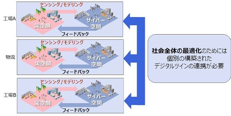 これらの課題を解決するためには、デジタルツインをより容易に構築可能とするとともに、複数のデジタルツインを連携することで、より大きなデジタルツインを構築し、部分最適をより全体最適へと近づけることが重要だと考えます。例えば製造業においては、工場のデジタルツインと物流のデジタルツインが個別に構築される場合が多いですが、それらを連携することでサプライチェーン全体のデジタルツインが構築でき、さらなる最適化が期待できます。そして、最終的には社会全体のデジタルツインを構築し、社会全体の最適化を行うことで、様々な企業、個人、社会の課題解決につながり、持続可能な社会の実現にも貢献できると考えています。