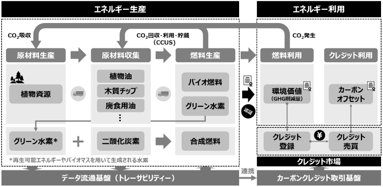 バイオ燃料や合成燃料の商用化促進と普及の鍵となるのが、データ流通基盤とカーボンクレジット取引である。商用化を進めるには、ISCC(国際持続可能性および炭素認証)やRSB(持続可能なバイオマス基準)に代表される、持続可能性認証の取得が不可欠である。これらは資源の調達から最終利用までのトレーサビリティー確保を求めている。例えば、バイオ燃料では、原料調達から最終利用に至るまでの温室効果ガス(GHG)排出量を定量的に評価し、その結果を信頼性のある形で示す必要がある。このプロセスを支えるのがデータ流通基盤である。データ流通基盤は、バリューチェーン全体の透明性と一貫性を保証し、ライフサイクル全体での削減効果を可視化する仕組みを提供する。また、カーボンクレジット取引は、GHG削減量を市場で売買可能なクレジットとして転換し、収益化する重要な仕組みである。これにはデータの正確性と透明性が欠かせず、データ流通基盤がクレジット取引の信頼性を支える役割を果たす。こうした仕組みにより、非化石エネルギーの普及と進展が加速すると考えられる。次回は、環境価値を経済価値に転換する方法について解説する。
