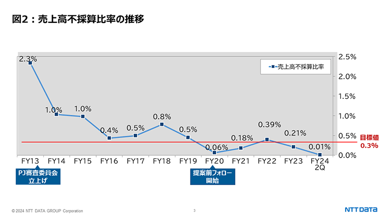 これらの仕組み整備や取組みを通じて、NTTデータではシステム開発プロジェクトの成功確度を高めるとともに、図2のとおり売上高不採算比率の低減という成果にも結び付けています。