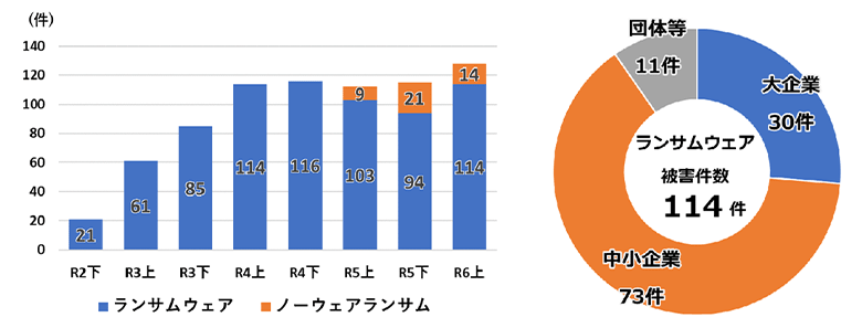 2024年のサイバーセキュリティを振り返ると、2023年に引き続きランサムウェアによる被害は深刻な問題となっています。警察の統計によれば、2022年度上半期に初めて100件を超えた被害件数は、2024年上半期も114件に上りました。2024年6月には国内大手の出版社が、10月には大手製造業の企業が被害に遭う事例が発生し、社会的にも大きなニュースになりました。