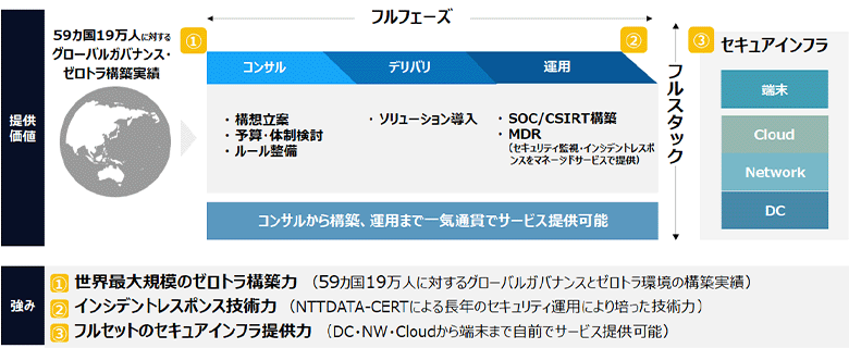 NTT DATAはグローバル展開するグループ企業として、世界59カ国の国と地域に対するグローバルガバナンスとゼロトラスト環境を実現してきました。この自社で構築した世界トップレベルのサイバーセキュリティアーキテクチャ、豊富なインシデント対応の経験から得たノウハウ、さらには、データセンター、ネットワーク、クラウド、端末までフルセットのセキュアインフラを提供できるNTT DATAの強みを生かしたソリューションをお客さまに提供しています。