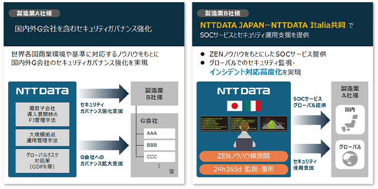 1つ目は国内の製造業のお客さまの事例です。国内外のグループ会社に対してセキュリティガバナンスを強化したいという課題を持っていらっしゃいました。NTT DATA自身も日本発のグローバル企業として、多くの困難に直面しながら海外拠点のガバナンス強化を実現してきました。例えば、異なる文化を持つ海外グループ会社との合意形成の難しさや、拠点の規模や要員のスキルレベルの違いに対応しながら、グループ全体のセキュリティレベルを底上げさせることなど、さまざまな課題を乗り越えて対策を講じてきています。こうして自社内でグローバル企業の持つ悩みを実際に解決してきた経験に基づき、お客さまのIT環境における課題の抽出、構想立案といったコンサルティングから、構築・運用まで一気通貫でサービスを提供しました。その結果、お客さまが目標とする業界レベルや基準に対応したセキュリティを実現しています。
