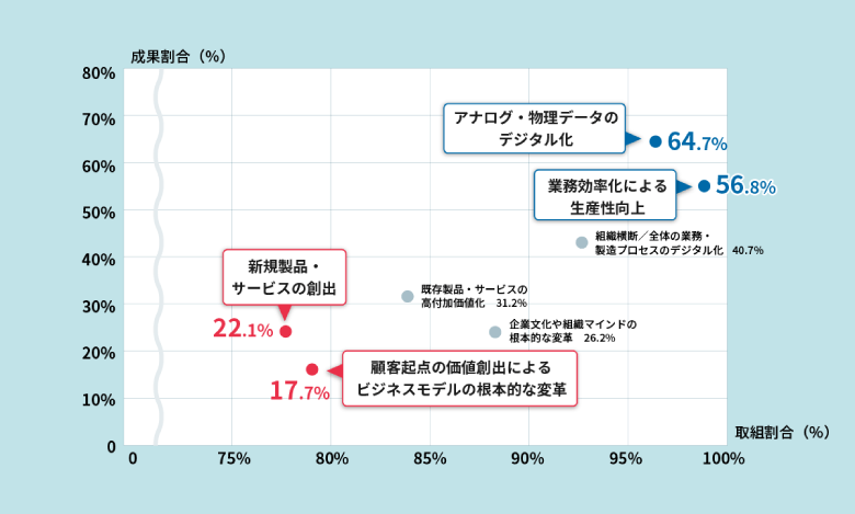 こうした課題は、実際の調査データでも明らかとなっています。「DX動向2024」(独立行政法人情報処理推進機構)では、項目ごとのDXの取り組み割合と、その成果の割合との関係を分析。「アナログ・物理データのデジタル化」や「業務の効率化による生産性の向上」といった“デジタル化”を目的とした取り組みでは成果の割合が高くなる一方で、「顧客起点の価値創出によるビジネスモデルの根本的な変革」「新規製品・サービスの創出」など競争力強化につながる成果の割合は低く、成果創出の難しさが表れています。