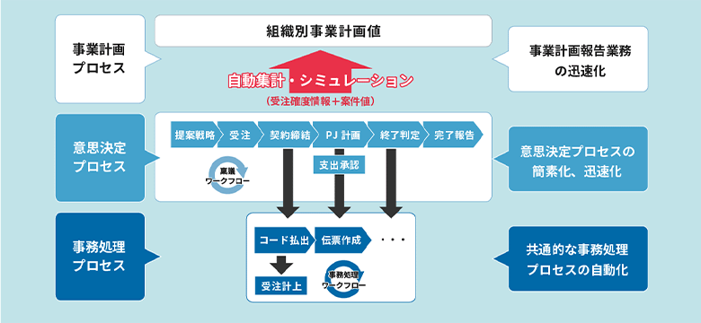 事業計画、意思決定、事務処理の各プロセスを連携させたフロー