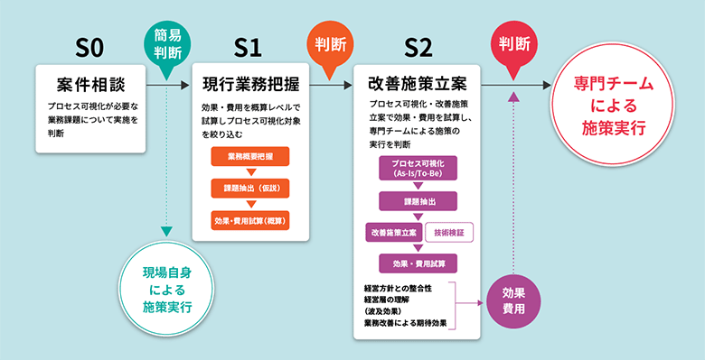 場合によっては、業務プロセスの見直しを一部の組織から実施し、成功事例を横や縦に広げていく段階的な進め方も必要になるでしょう。