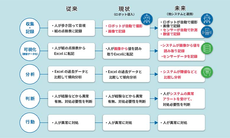 現在は、ロボットと人による管理を並行運用しており、故障時にロボットが読み取ったさまざまな数値データと人の感覚との整合性を解析し、故障や異変の判断基準の設定を検証しています(事例④図参照)。