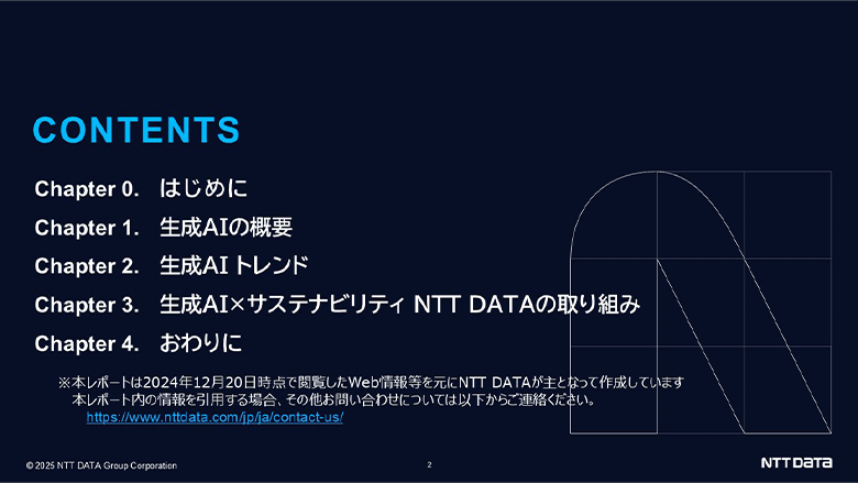 テクノロジー×サステナビリティと題して、連載の第2回では生成AIとサステナビリティのトレンドを解説してきました。本記事で紹介した内容の詳細に加え、ホワイトペーパーではNTT DATAにおけるシステム開発の全工程での生成AI活用や、社内業務への適用例についても紹介しています。(※4)