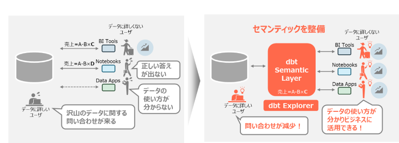 dbt Coreには意味的(セマンティック)な情報が表現できません。そのため、ユーザがデータだけを見て独自に分析を進めることが困難です。また、高度なユーザが独自に解釈して作成されたデータ加工ロジックが乱立し、ビジネス上重要な指標等が分散されて実装されてしまうことがあります。