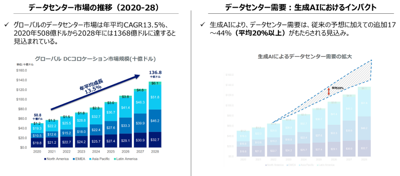 グローバルのデータセンター市場は、2020年から2028年にかけて年間平均13.5%で成長すると予測されている成長領域です。この8年間で市場規模は2020年の508億ドルから2028年の1368億ドル、日本円だと約20兆円へと拡大し、約2.5倍以上の規模になると見込まれています。