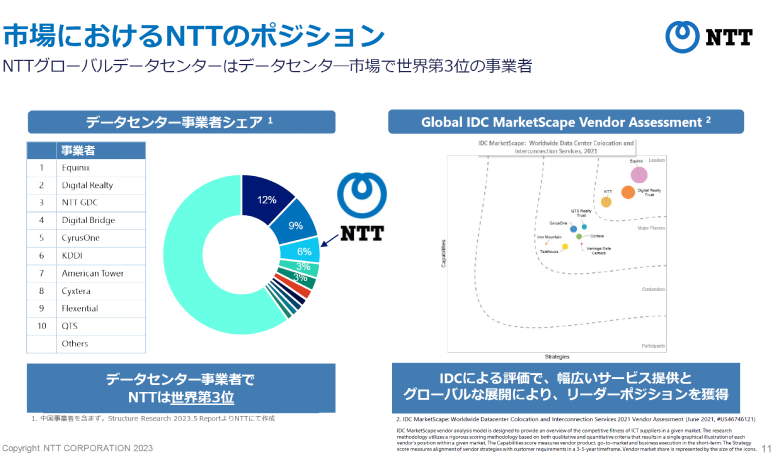 図2:データセンター市場におけるNTTグループのポジション(出典:NTT IR DAY 2023)