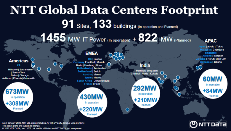 NTTグローバルデータセンターは、現在海外に91拠点、133のデータセンターを保有(一部は計画中)しており、2025年1月時点で1,455メガワットを運用中、822メガワットが計画中となっています。今後も旺盛なデータセンター需要に応えていくため、アメリカ、EMEA(欧州・中東・アフリカ)、インド、APAC(アジア太平洋地域)、それぞれで提供容量の増強を計画中です。