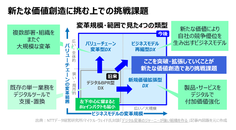 企業の価値創造プロセス全体をバリューチェーンの変革範囲(以下図、縦軸)とビジネスモデルの変革規模(以下図、横軸)で示すと、多くの企業は既存の単一業務をRPA(ロボティック・プロセス・オートメーション)などのデジタルツールで効率化する段階にとどまっている。このアプローチでは局所的・限定的な変革に留まり、大きな経営インパクトを期待できない。