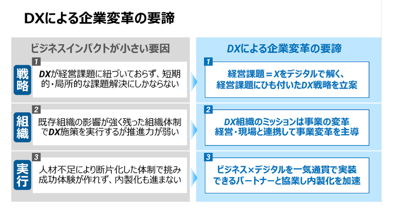 企業変革の実現には、戦略・組織・実行の3つの観点からの取り組みが不可欠だ。戦略面では、経営課題をデジタルで解決することが重要となる。アジャイル開発や生成AIの導入は重要だが、それだけではイノベーションは起きない。経営戦略とひも付いていなければ、効果も明確にできない。自動車であればソフトウエア、小売りであればグローバル化など、経営課題を設定してビジネス成果を生み出すためのDXに取り組んでいくことが必要になる。それがあってどうデジタルを活用していくのかが見えてくる。