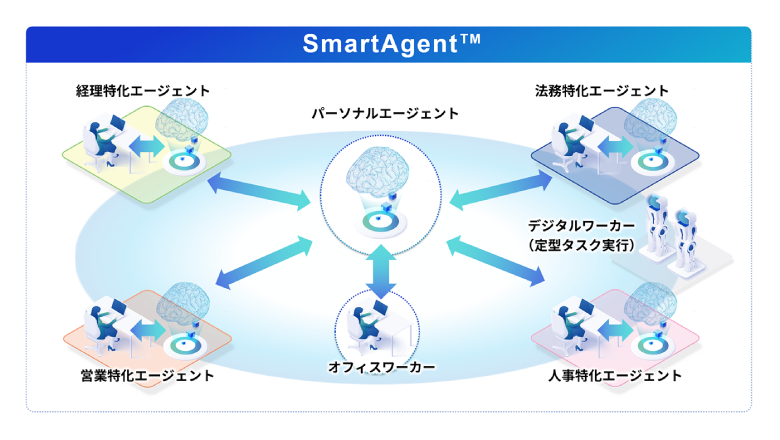 例えば、「SmartAgent™」を導入すると、従業員一人ひとりに、物事の判断を支援する汎用AI「パーソナルエージェント」が割り当てられる。指示を受けたパーソナルエージェントは、経理特化AIや法務特化AIなどの専門知識を持つ「特化型AIエージェント」とコミュニケーションを図り、従業員の意思決定を支援する。そして、アウトプットの際には、特化型AIエージェントから得た情報を基に、パーソナルエージェントが「デジタルワーカー」に資料作成を依頼する。AIがAIと協調することで、従業員が効率的に業務を遂行できるというわけだ。