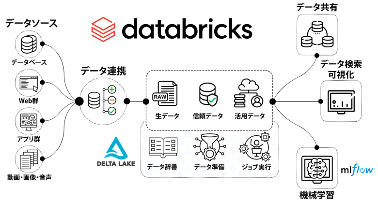 Databricksはデータレイクハウス(※5)というアーキテクチャを中核として、データと同一基盤上でAIの開発と運用まで実現する、データとAIの統合プラットフォームです。構造化データ、非構造化データ、AIを全て集約管理してガバナンスを効かせながら、あらゆる用途に活用するための機能を、All in Oneで提供しています。