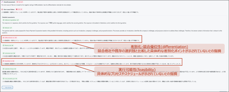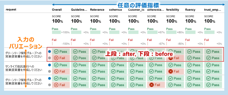 具体的には、まず応答精度をAIエージェントの動作単位で定量評価し、AIエージェントの各構成要素における改善点を特定しました。評価指標として、ハルシネーション抑制や実行可能性など多角的な指標を設定しました。