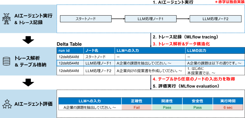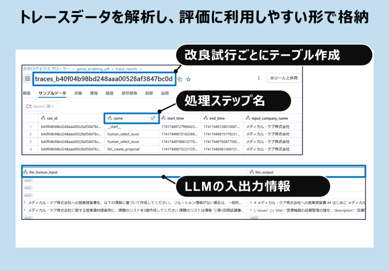 そこで、3の処理では、独自実装によりトレースを解析および加工し、AIエージェントの各処理ステップを1行単位で保持するテーブルに保存しました。これにより、後続の処理で任意の粒度の単位を選択して評価に活用できるようになりました。これらの処理フローは、任意のAIエージェント開発に転用可能になっています。