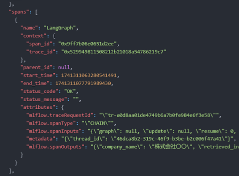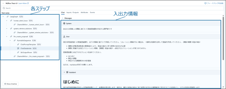 例えば2の処理では、Mosaic AIが提供するMLflowのネイティブメソッドを用いたトレース(※10)と呼ばれる挙動データを記録し、処理フローを可視化します。これにより、AIエージェントがどのような手順をたどり、どの工程に時間を要し、最終出力へ至ったかを画面上で確認できます。