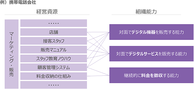 たとえば、携帯キャリアの「対面でデジタルサービスを販売する能力」は、店舗、販売スタッフ、教育体制、顧客管理システムといった複数の経営資源の高度な統合によって成り立っています。このような組織能力を明確に認識することができれば、異業種展開や新規サービス開発の起点として機能し得ます。