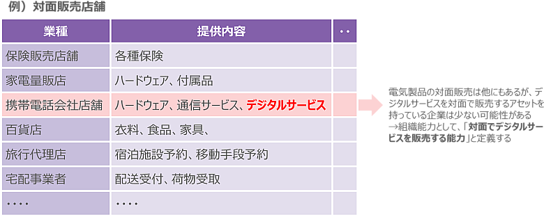 加えて、他業態と比較することで、当該アセットの独自性がより鮮明になります。たとえば、家電量販店によるハードウェアの対面販売に対し、携帯キャリアが担っているのは“デジタルサービス”そのものの対面販売であり、これは極めてユニークな能力と言えます。(図3)。