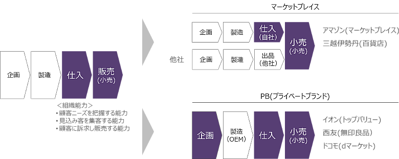 代表的な例が、小売業における店舗アセットの活用です(図4)。ここでは、顧客ニーズの把握力、見込み顧客の集客力、顧客への訴求・販売力といった組織能力が鍵となります。これらを活用することで、Amazonが他社にも売場を開放するマーケットプレイス事業を行ったり、総合スーパーがプライベートブランド(PB)を自社主導で展開したりしています。後者はイオンの「トップバリュ」や、西友から生まれた「無印良品」が、その代表格でしょう。